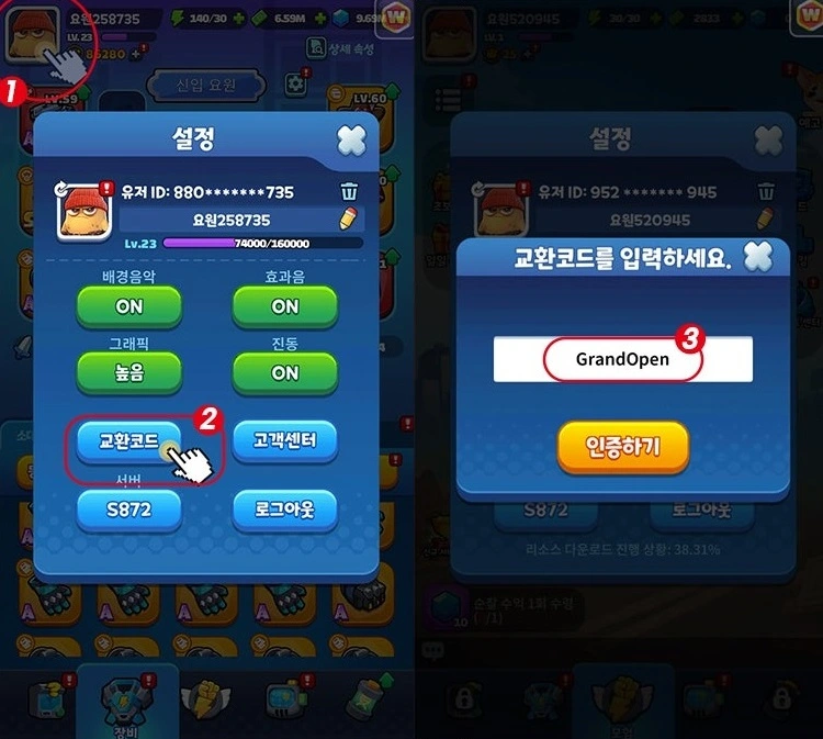좌측 상단 캐릭터 프로필 클릭 - [교환코드] 클릭 - 교환 코드 입력